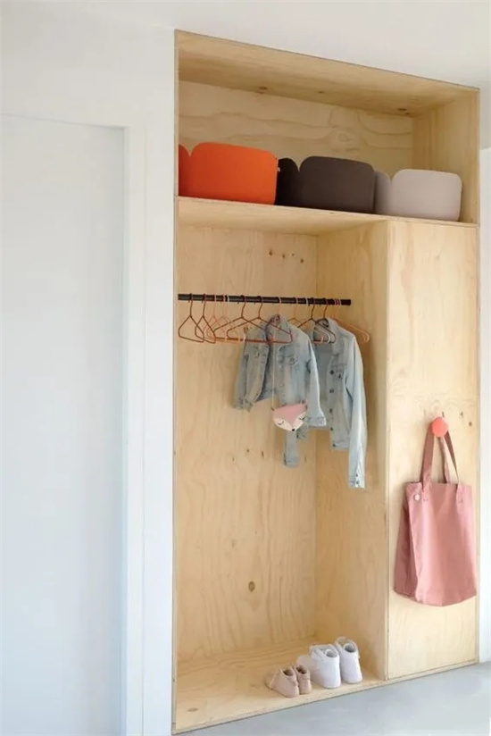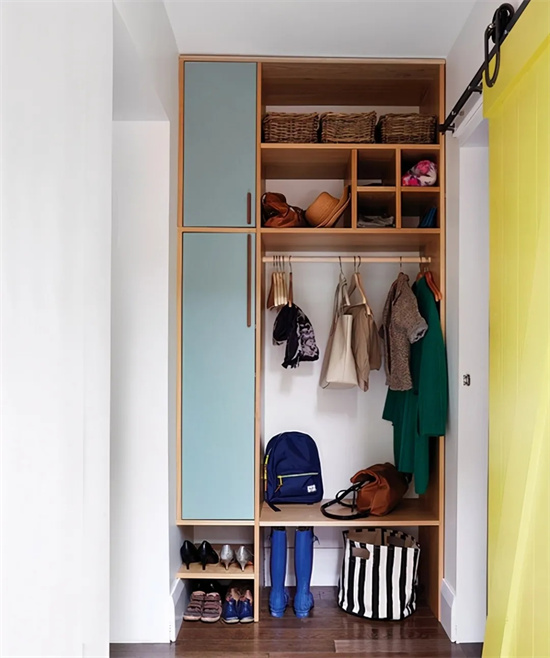 你们可以选择利用门后方空间,家里来人的时候门一关还能起到一个遮挡的作用,保护隐私也不占地。如果家里有两层的话,楼梯下方空间也能利用上,内嵌式的玄关柜空间,也能作为步入空间使用。