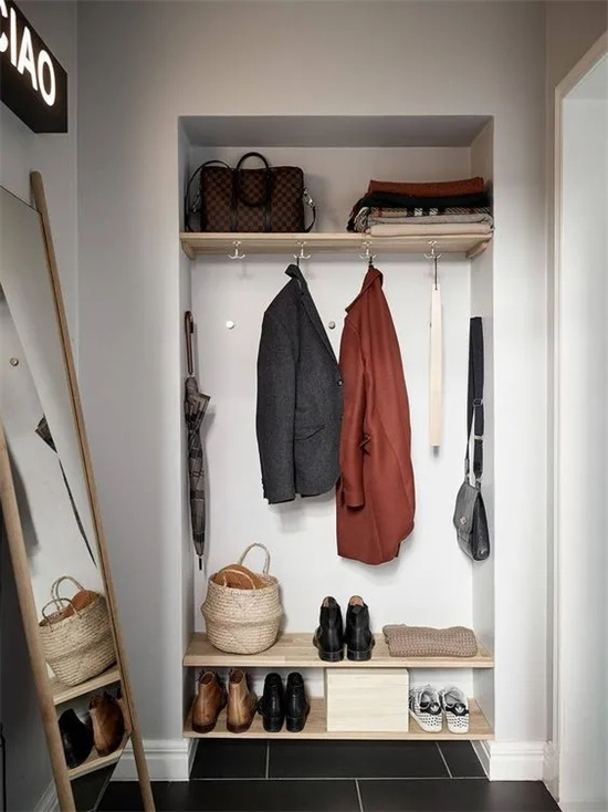 想给玄关装个柜子做衣物鞋子收纳,但是进门处空间也只有那么一点,而一般柜子的宽度都在600~800mm中间,装不好真的很占地。不妨试试这种嵌入式的玄关柜,没有储物柜堆积的现象,入墙也不占用外部走道空间,更适合小户型。