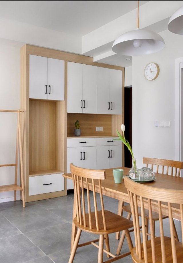 白色的门板搭配以黑色把手,既有对比性又有整体性,换鞋凳与置放区之于实用主义;鞋柜在设计之处就从实用出发,尽可能的将两人每个季节的鞋子进行一个分类:常用和不常用的区分;以及回家换鞋的习惯摆放方式;出汗以后鞋子会有味道又没来得及清洗时如何保持洁净的等的处理方式来设计。