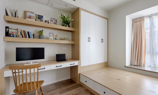书房将休息、办公、学习、储物这四大重要功能基本满足后空间看上去依旧很开拓,榻榻米确实是一个不二之选;你在看书,我在记录,共同进步;