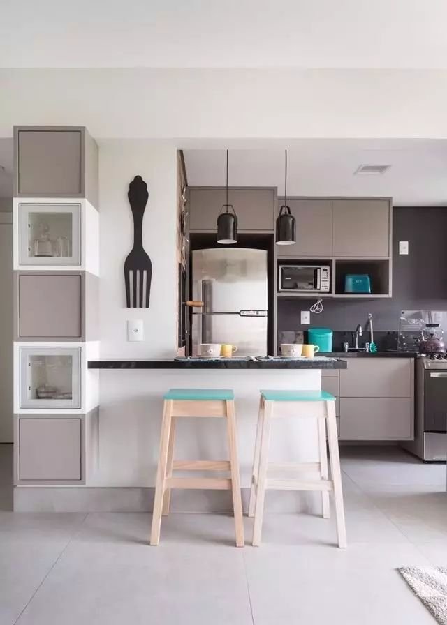 当然,吧台也并不是非得与厨房绑定在一起,家里有适合的空间都能让它发挥作用,比如它还能搭配上储物柜,摆上家里的零碎物件,收纳作用也不错。