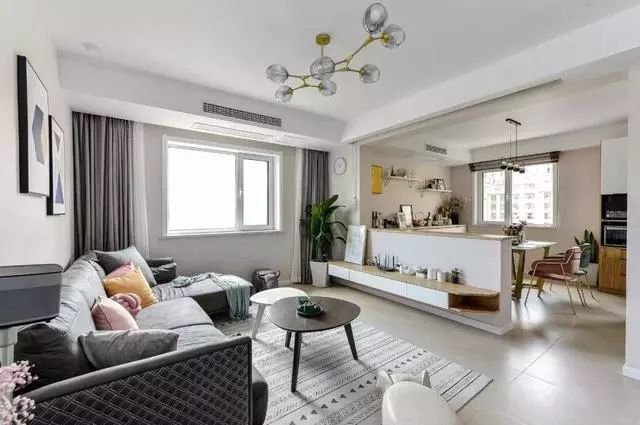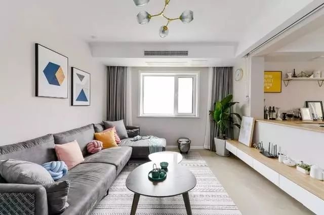 客厅取消传统电视背景墙,顶面隐藏幕布,以投影的方式满足观影的需求,不用的时候可以收起来,空间更开阔。