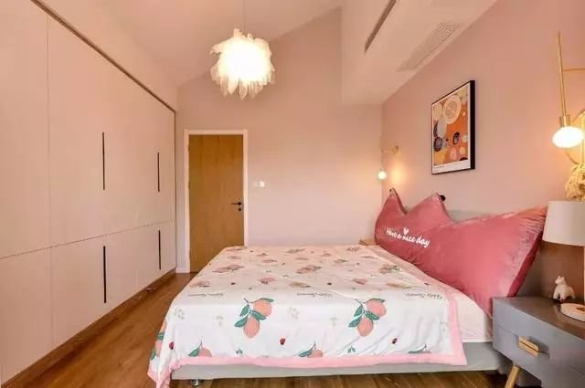 阁楼一处是公主房,用粉色基调配暖光灯饰,可爱又温馨。