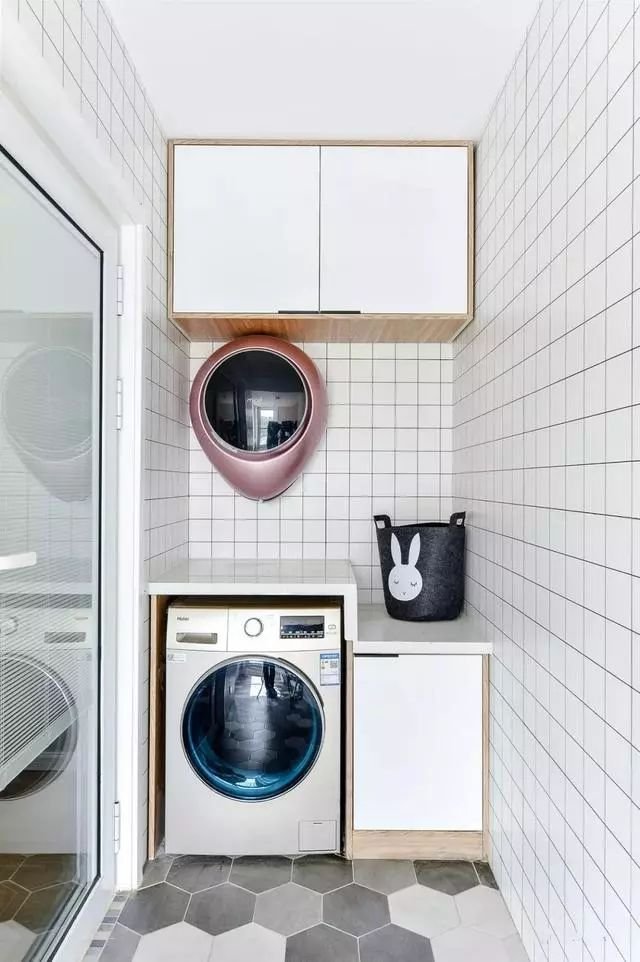 在阁楼走廊尽头规划洗衣区,拼色六边形地砖搭配网红小白砖,整体颜值非常高。